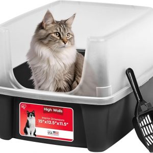 IRIS USA Large Cat Litter Box with Scatter Shield and Scoop, Open Top High Sided Cat Litter Pan, Black