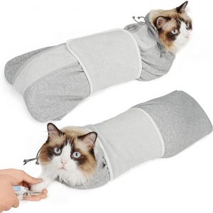 Supet Cat Grooming Wrap for Cutting Nails, Self-Adhesive Anti-Scratch Swaddle with Bite-Proof Mesh Hood & Thick Waist Strap Anti-Escape Bag for Nail Trimming, Medication, Ear Cleaning (Grey S)